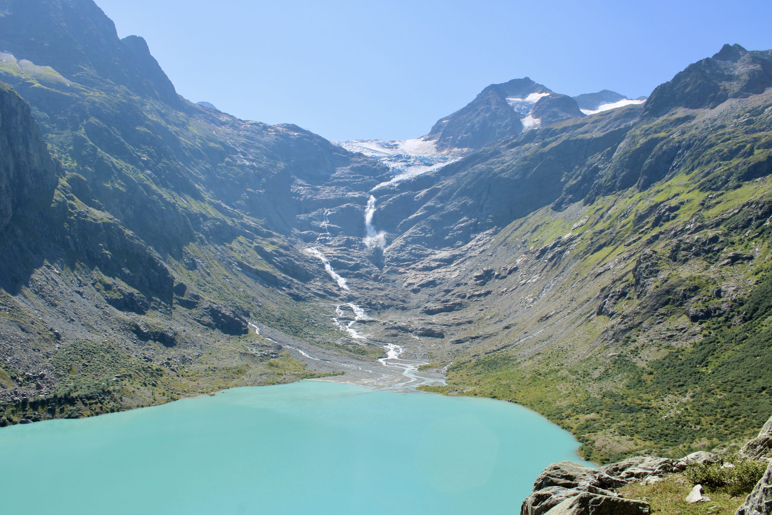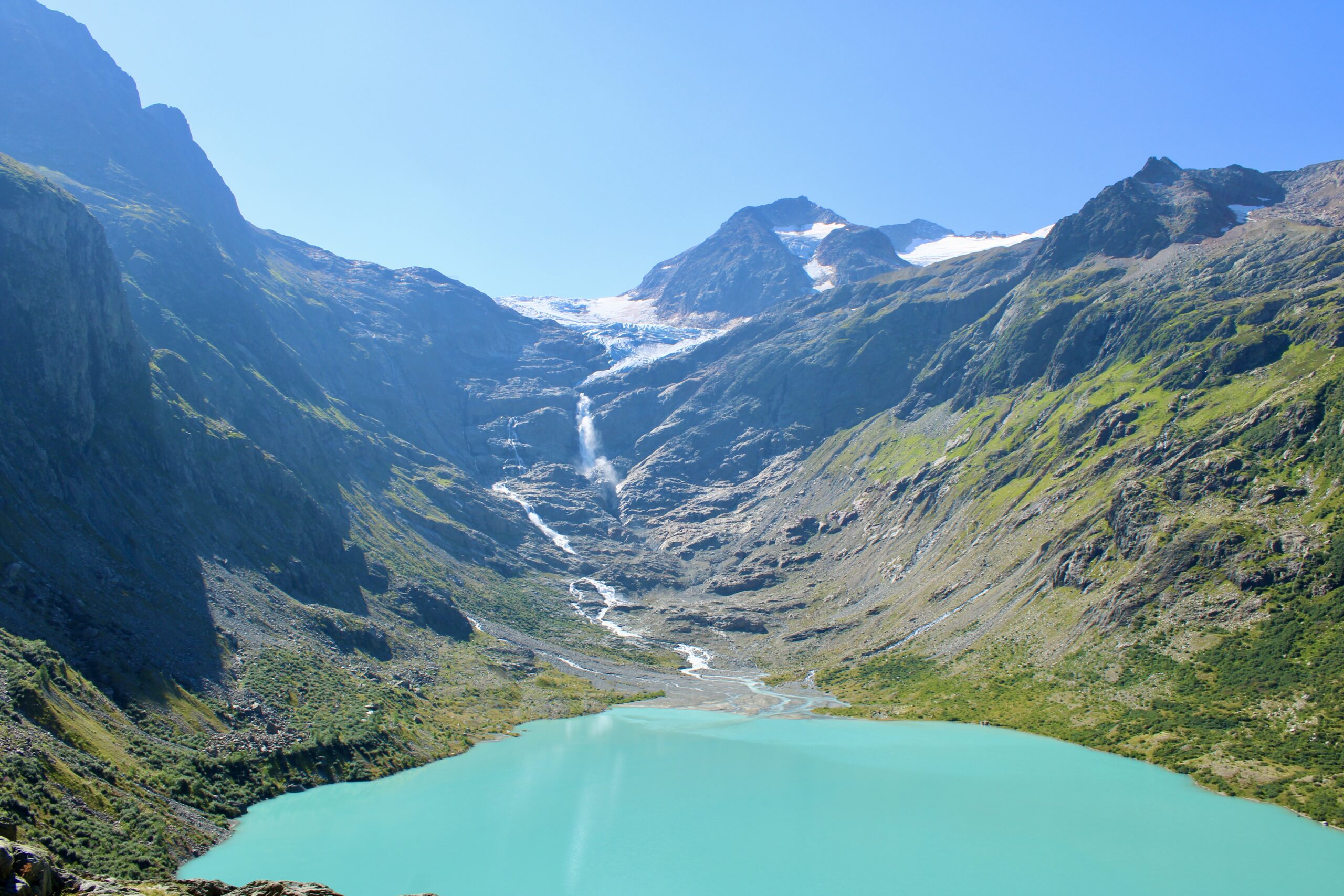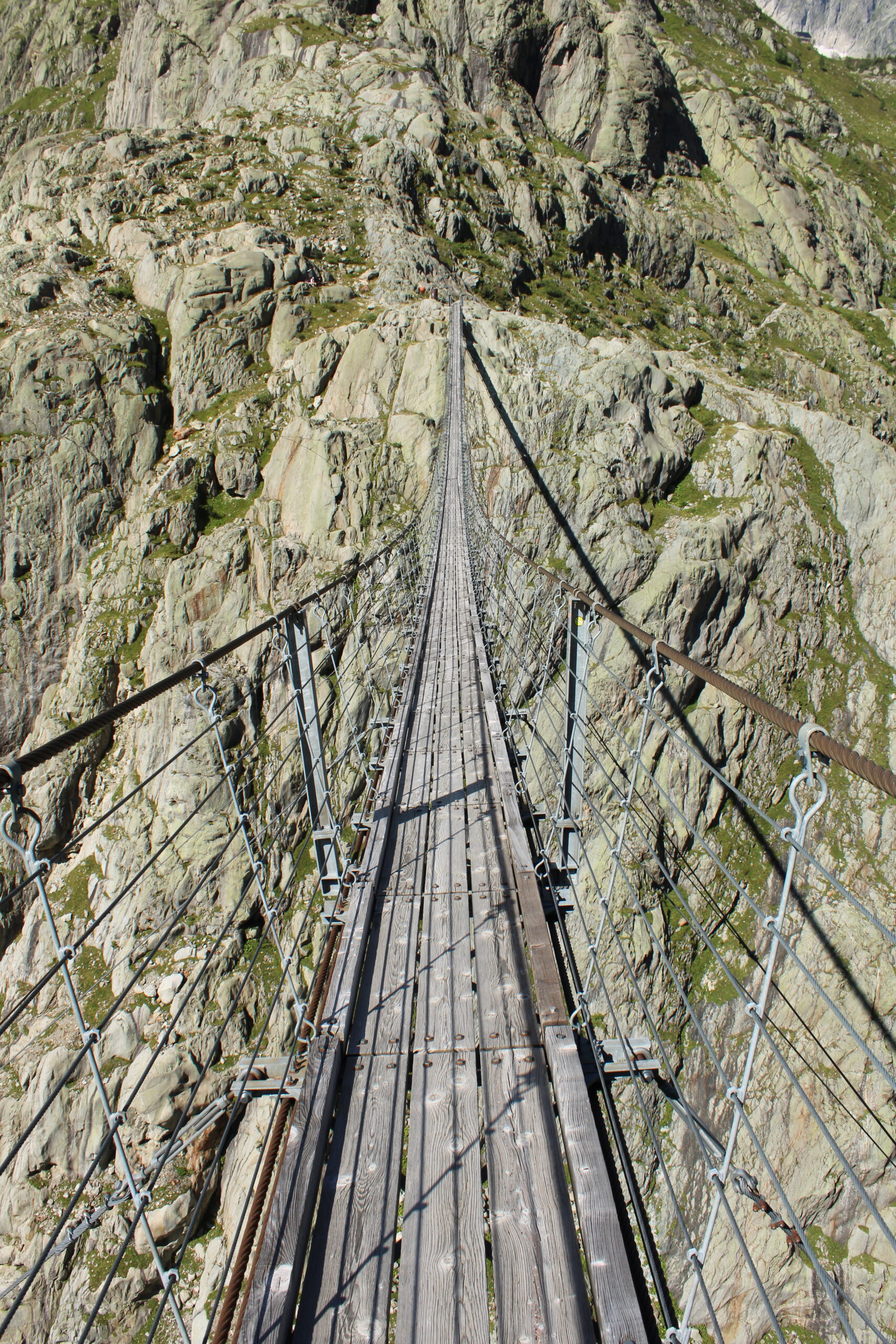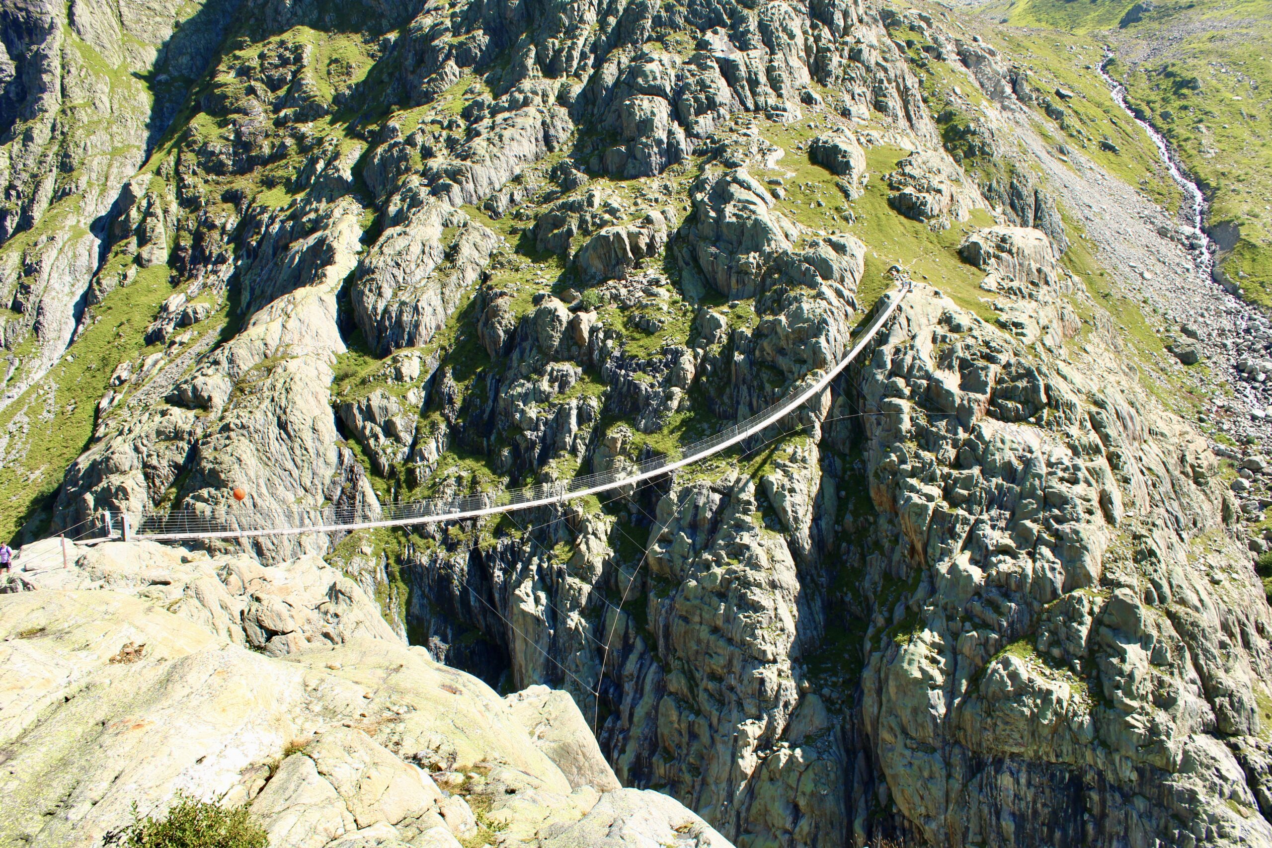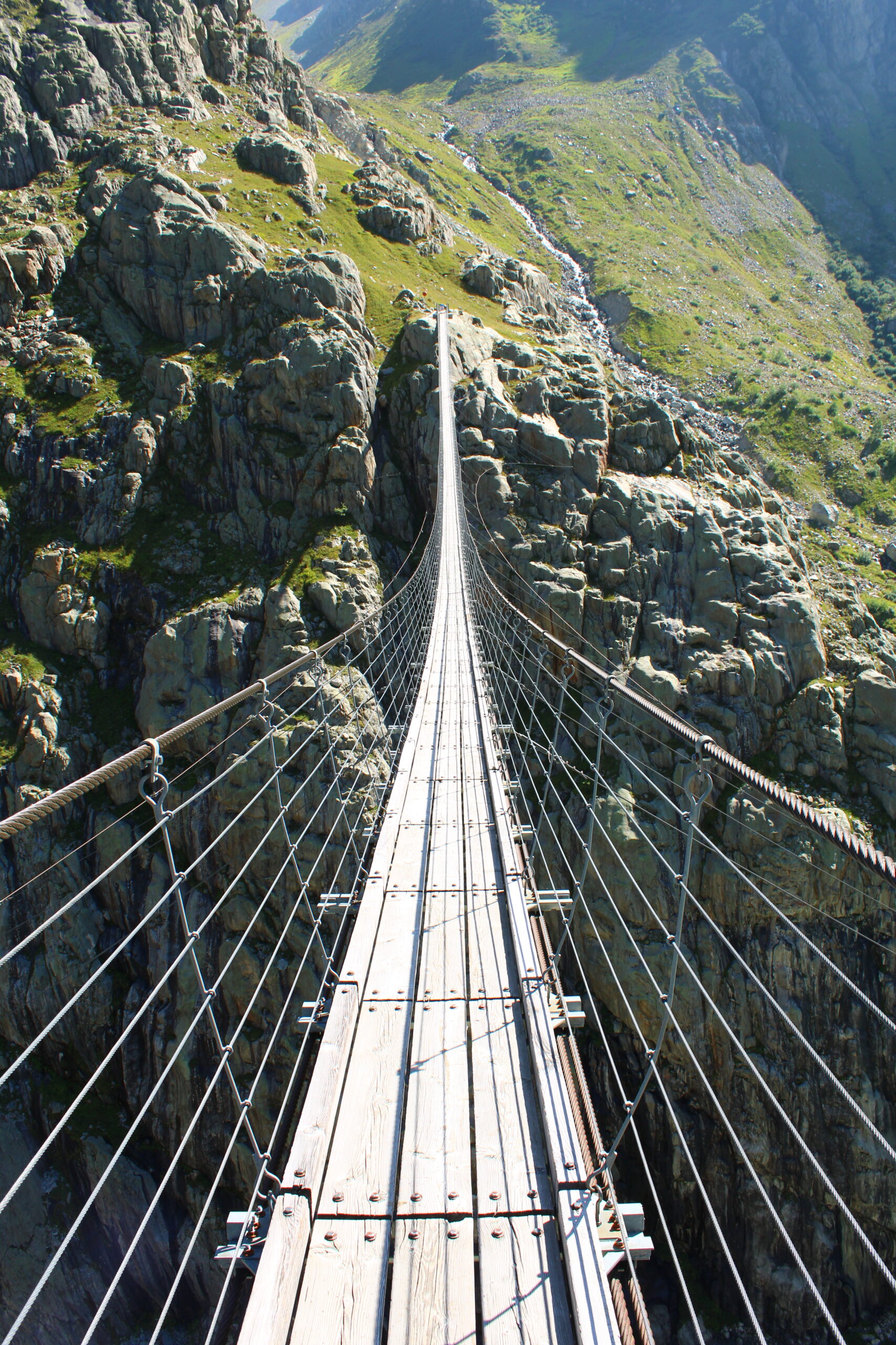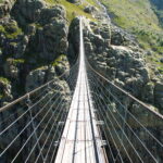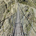 Cette randonnée permet d’atteindre le pont du Trift, une passerelle suspendue offrant une vue impressionnante sur le glacier du Trift et son lac aux eaux bleu turquoise.