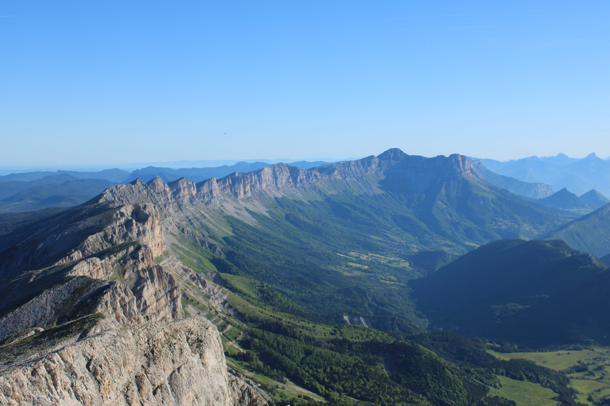 Une fois au sommet, la vue est exceptionnelle : immenses falaises du Vercors, panorama à 360° sur les Hauts Plateaux, la chaîne des Alpes et le mont Aiguille. Un moment fort du trek.